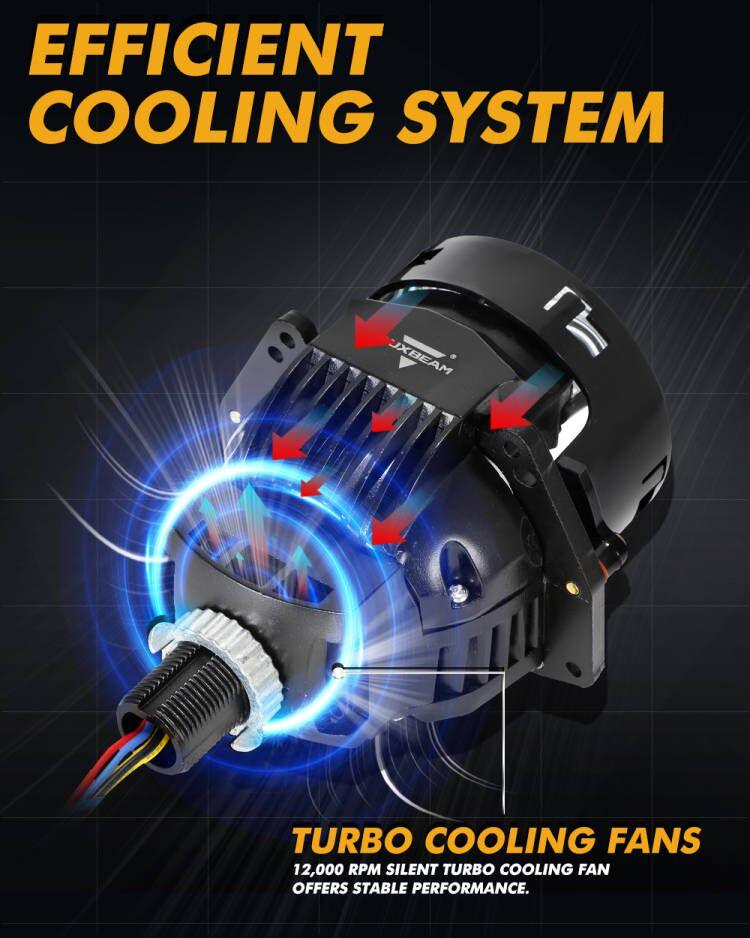 - The full aviation aluminum body and built-in 12,000RPM silent turbo cooling fan, provide fast and stable heat dissipation to maximize the lifetime and brightness of the bi-LED projector lens headlight.
