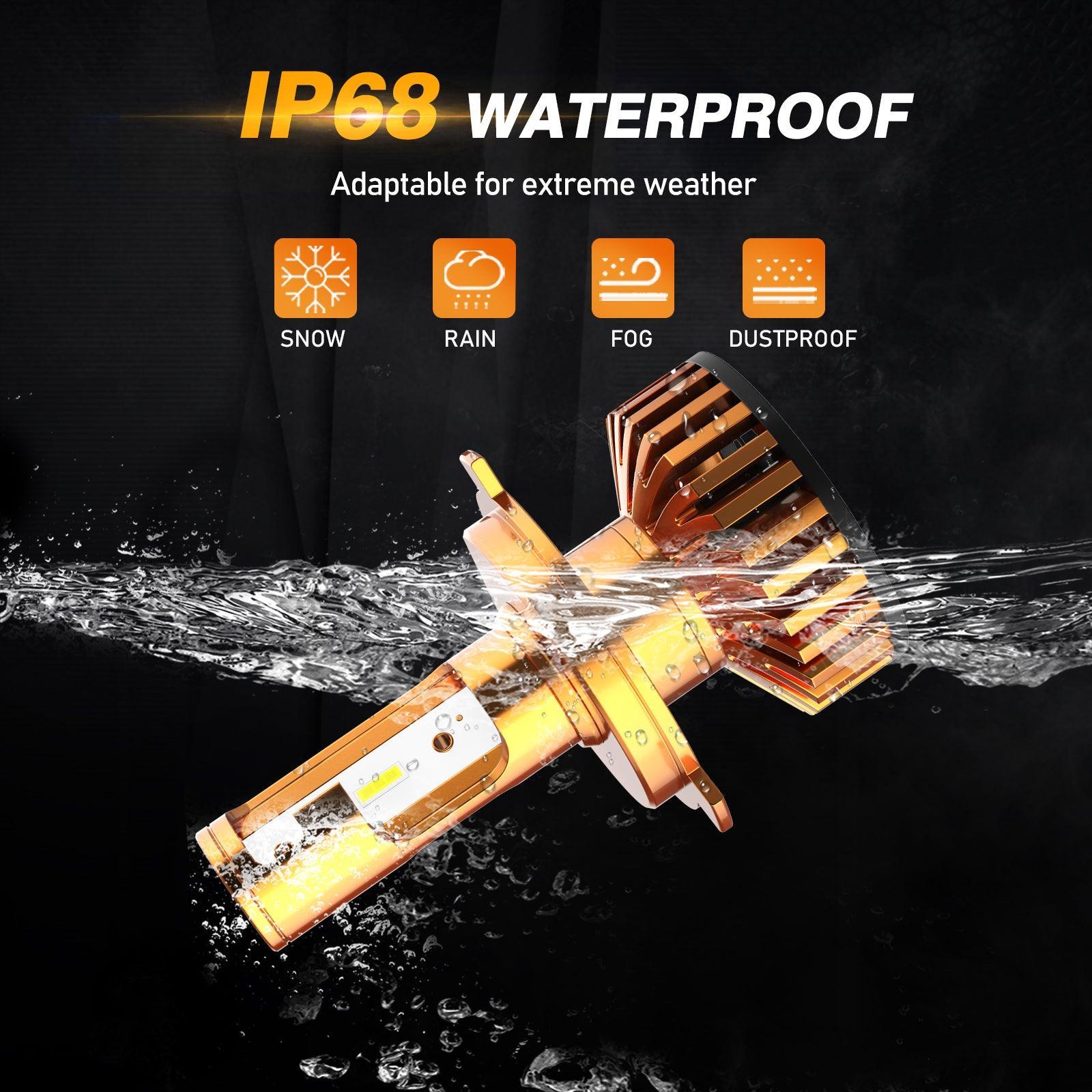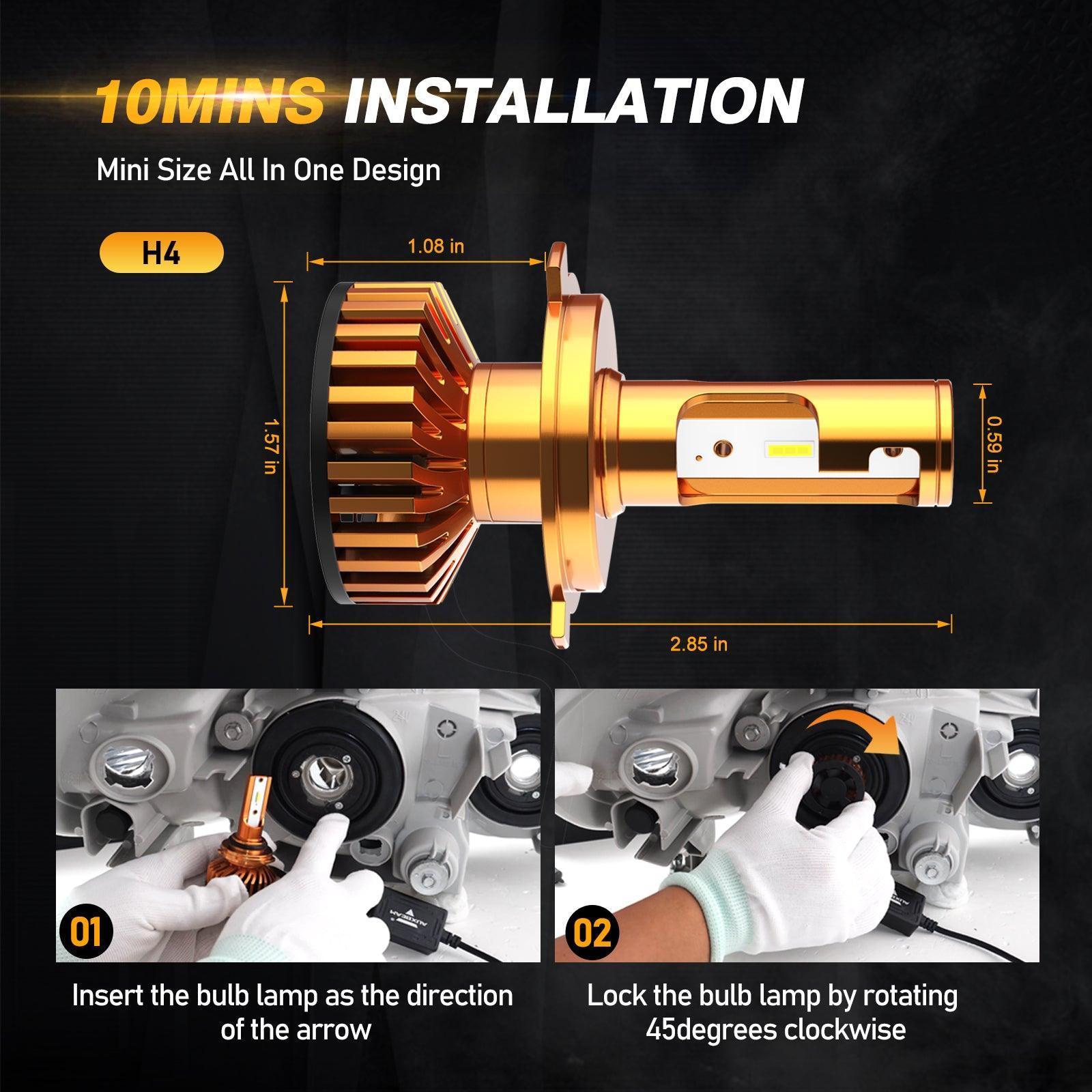 - H4 LED light bulbs with 360° illumination CSP LED double-sided chips, provide up to 300% more light with a 6500K Xenon white clearer color. Luminous Flux: 10000lm/set (5000lm/bulb),3 times brighter than the halogen lamp.