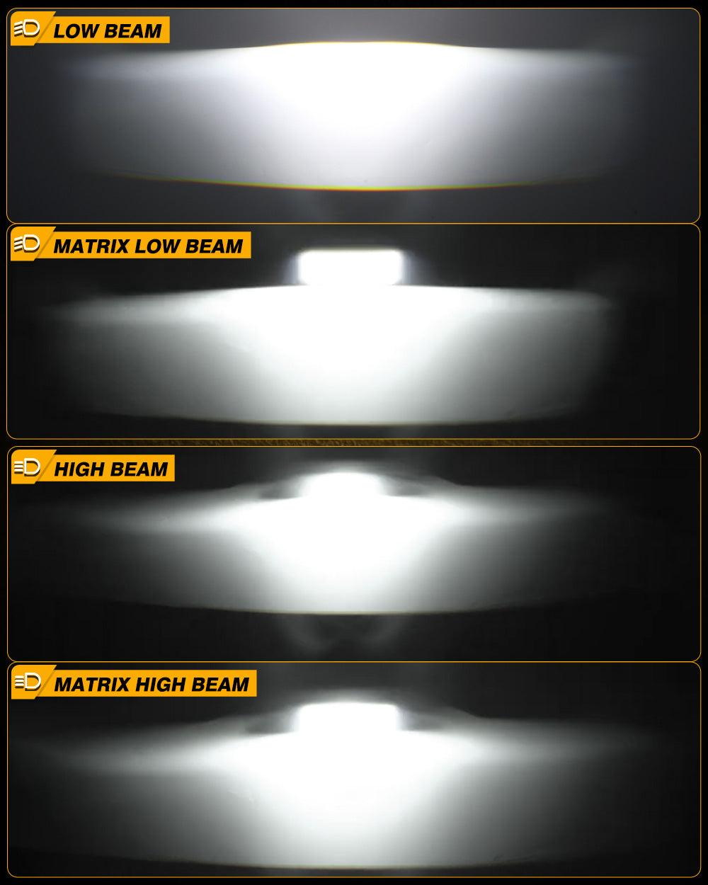 - Each projection lens is equipped with 6 PCS SMD3570 LED chips + 3 PCS SMD1860 auxiliary matrix LEDs; The high beam power is 45W, and the low beam power is 35W, With a maximum luminous flux of up to 6000Lm.