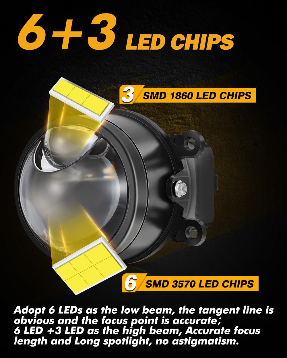 - Adopt a unique hyperboloid lens and advanced 6+3 LED chip design that can provide you with a clearer and more comfortable vision and ensure your driving safety.