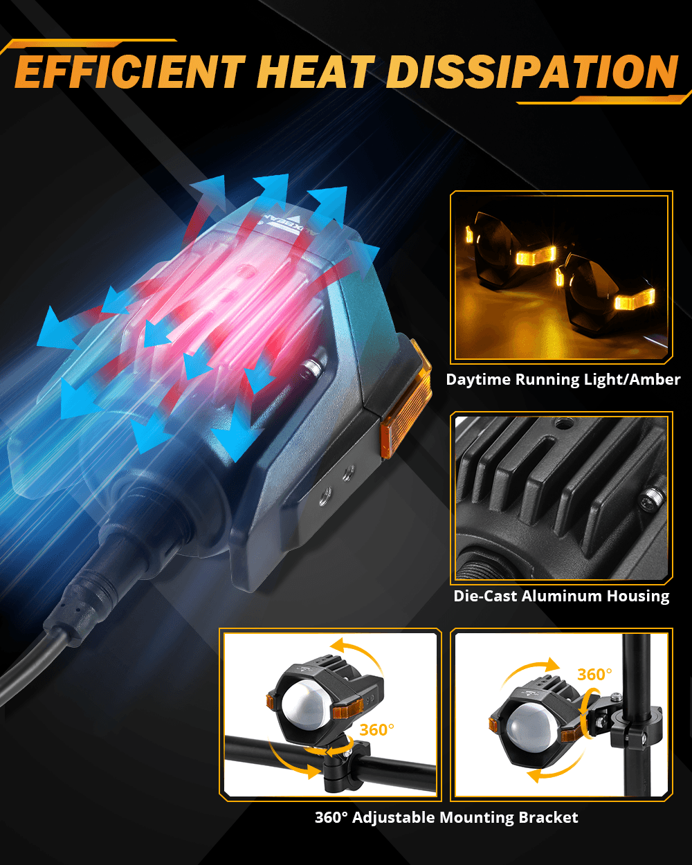 - The dual-color LED motorcycle spotlight has 3 main lighting modes: DRL(amber)、always-on mode and flashing mode.