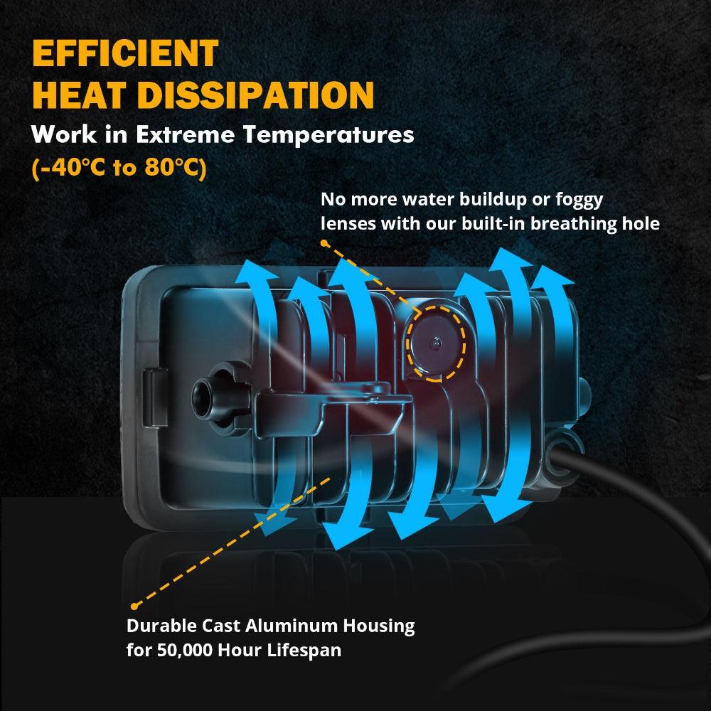 - The mirror surface is made of PC fireproof and high-temperature resistant polymer material. The back shell is made of durable die-cast aluminum and the back of the sealed shell has rebreathing holes, which can better dissipate heat, keep the lens cool, prevent water ingress and fogging, rust-proof, shock-proof, and IP67 waterproof.