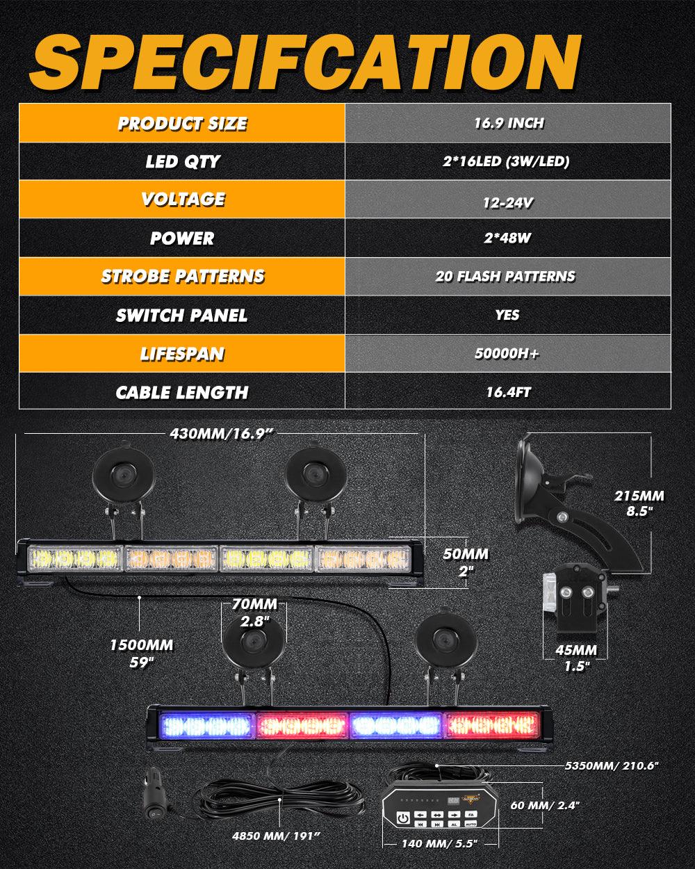 Great For Traffic Advisor: This windshield traffic advisor strobe light bar features 4 LED modules with a total of 32 high power LEDs. Improved lens that allows the brightness to be magnified and be seen at a greater distance, even visible during daytime conditions. lifespan over 50,000 hours.