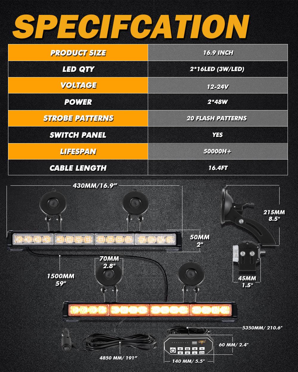 Great For Traffic Advisor: This windshield traffic advisor strobe light bar features 4 LED modules with a total of 32 high power LEDs. Improved lens that allows the brightness to be magnified and be seen at a greater distance, even visible during daytime conditions. lifespan over 50,000 hours.
