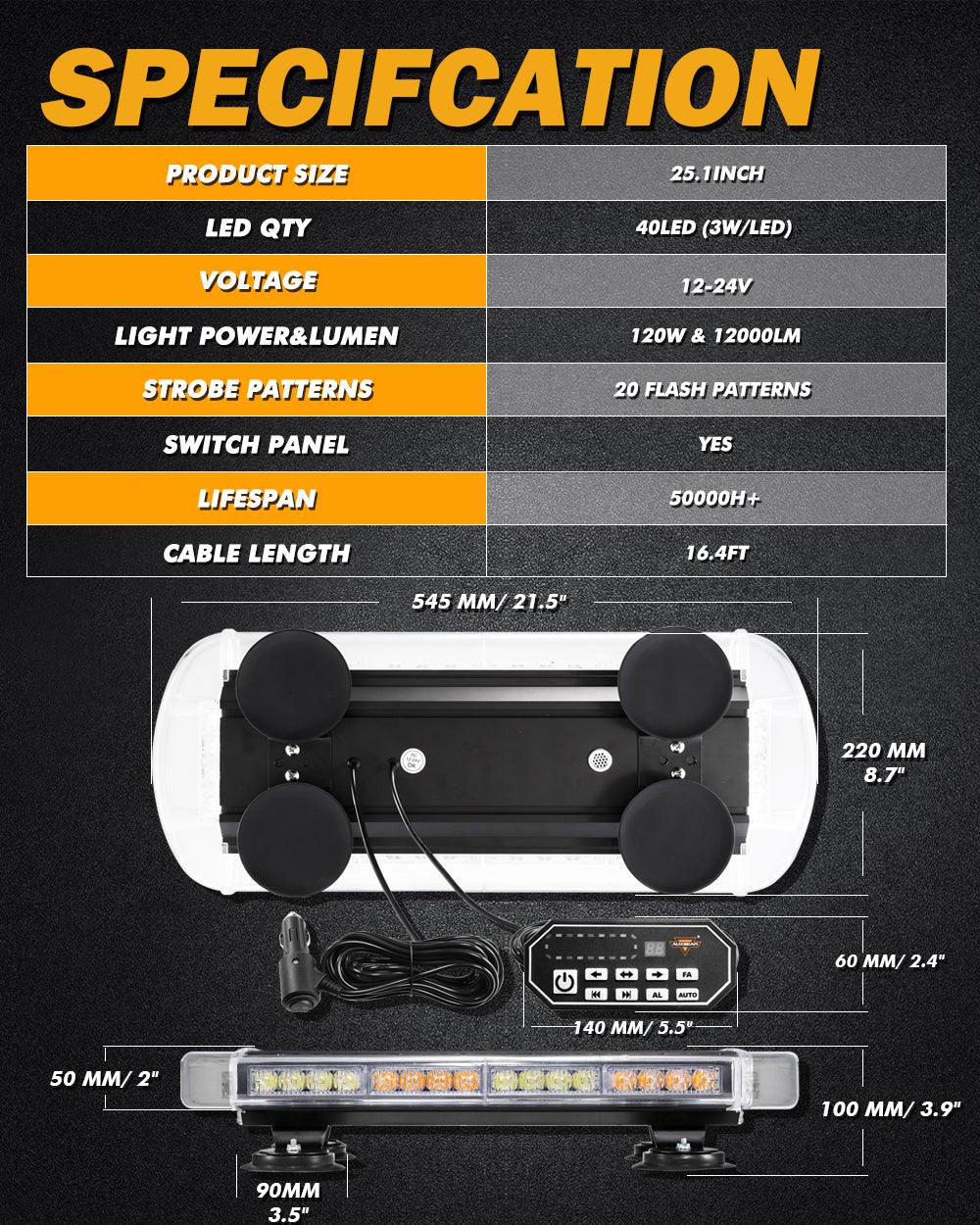 Perfect Bright: This emergency flashing light bar has a total of 40 high-power 3W LED chips. Crystal clear lens for max brightness, visible day and night. Great for law enforcement cars, plow trucks, construction vehicles, tractors, security, snowplow, postal, mail carrier, and city service workers, to warn of potential hazards.
