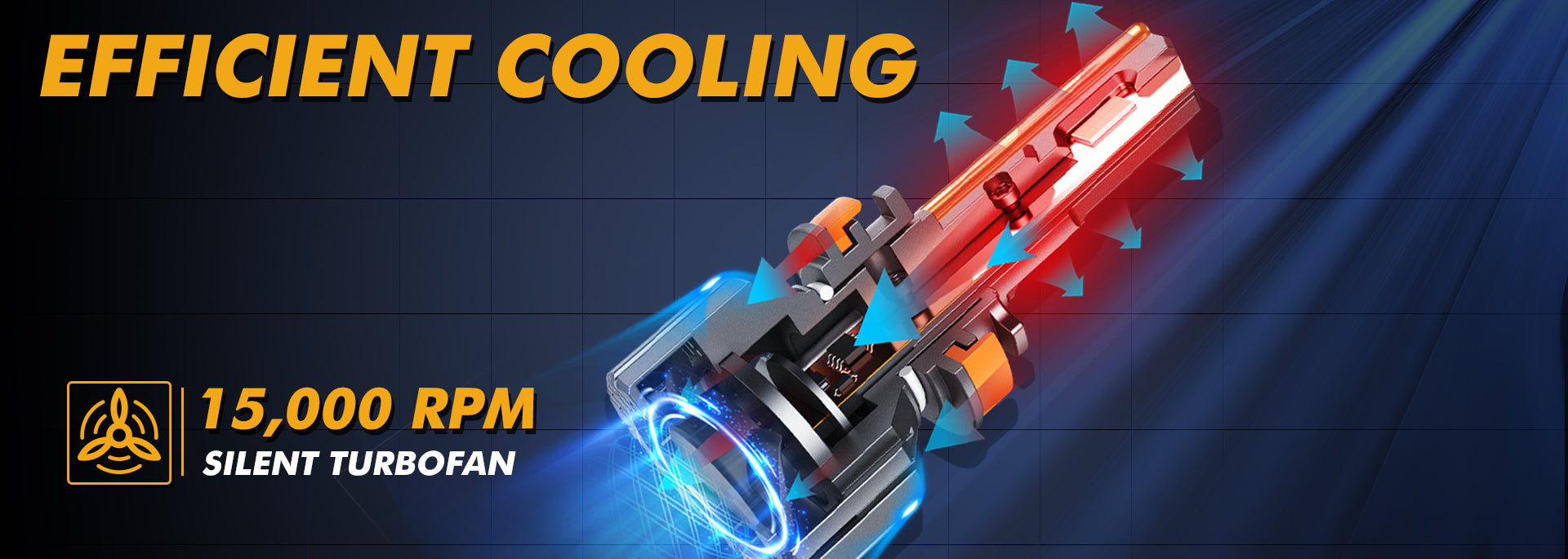 - Diseño de enfriamiento de cinco capas: los sustratos de cobre rojo que llevan LED + cuerpo de lámpara de aluminio de aviación 6063 + disipadores de calor únicos de 22 piezas + el último tubo de cobre de refrigeración líquida + turboventilador silencioso de 15,000 RPM mejoran directamente la disipación de calor en un 150%.