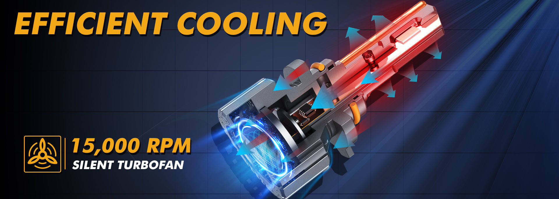- Diseño de enfriamiento de cinco capas: los sustratos de cobre rojo que llevan LED + cuerpo de lámpara de aluminio de aviación 6063 + disipadores de calor únicos de 22 piezas + el último tubo de cobre de refrigeración líquida + turboventilador silencioso de 15,000 RPM mejoran directamente la disipación de calor en un 150%.