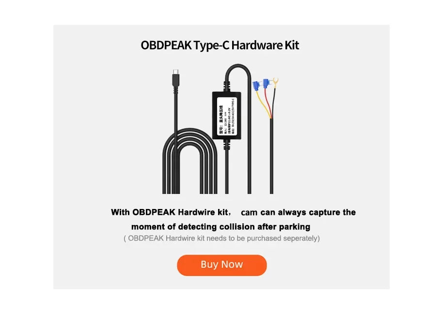 24H parking cable allows you to connect dash cam to a vehicle battery source, get constant power supply from the battery directly, so your car DVR will keep work even when ignition is off. (Additional purchase of hardware cable is required)