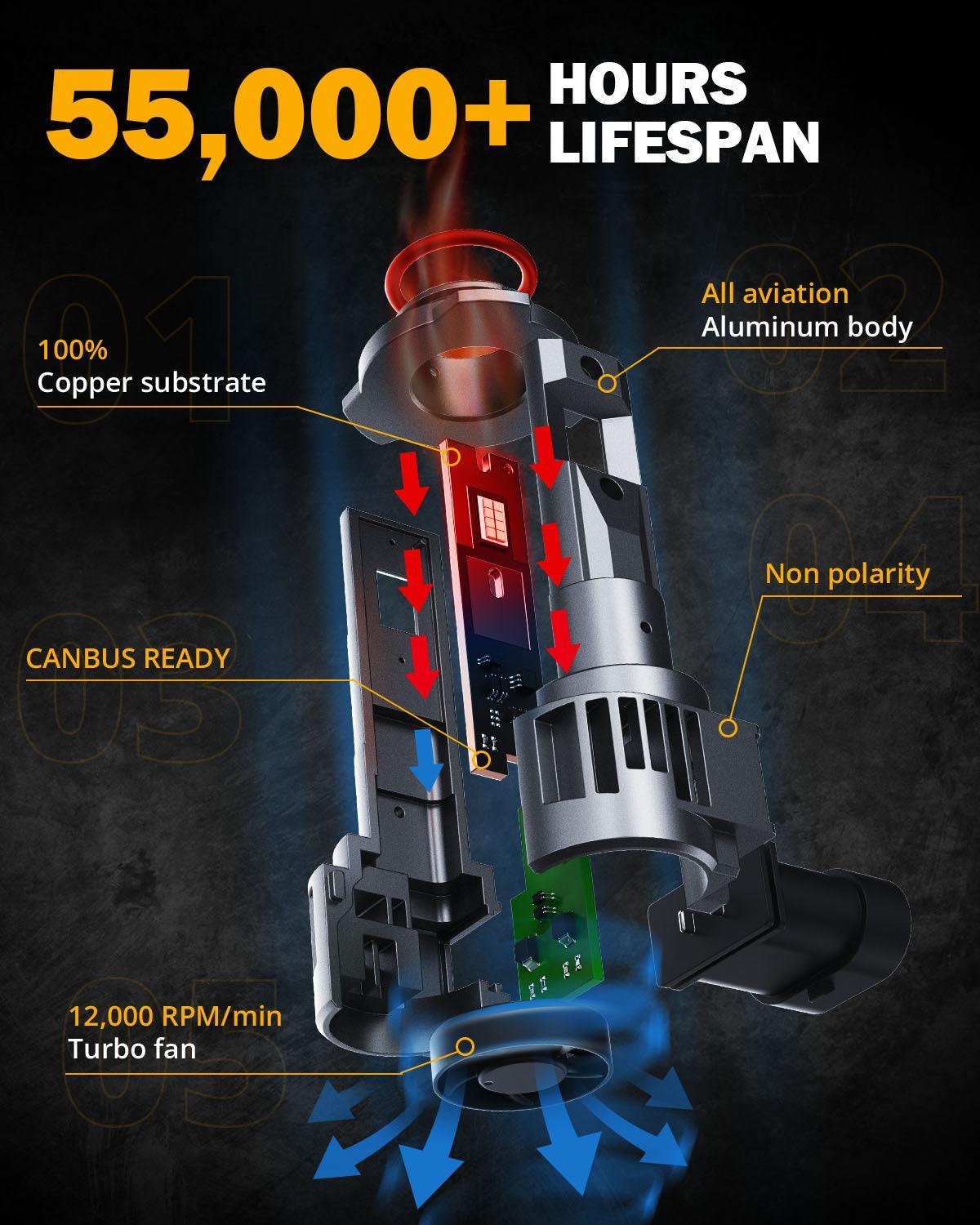 - Avance tecnológico con la estructura de bombilla de tamaño pequeño, potencia de arranque de 45 W por bombilla, aún puede mantener la estabilidad. Soporte de potencia de 35 W después de una conducción prolongada, 18 chips LED CSP por bombilla, iluminación de alto lumen con salida de blanco frío de 6500 K, lo que mejora la visibilidad al conducir de noche.