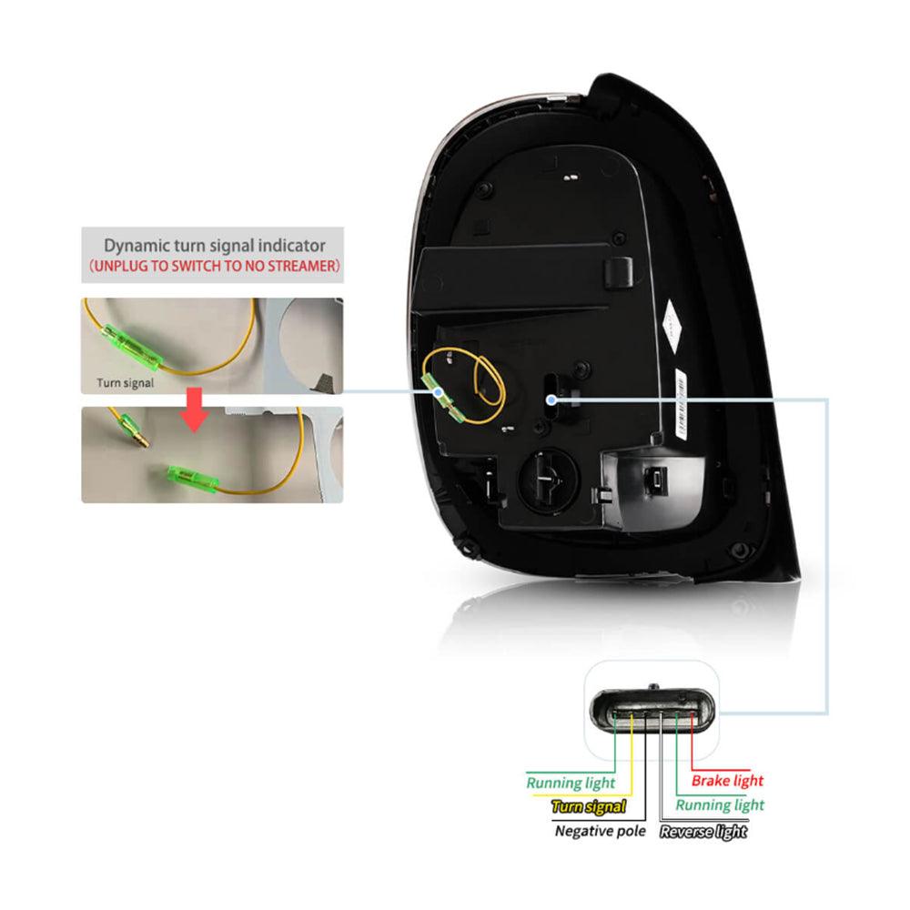 - Red Running Light +Amber Sequential Turning Light (Just disconnect the green plug if you don’t want the sequential feature) + Red Brake Light + White Reverse Light + Union Jack Design.
