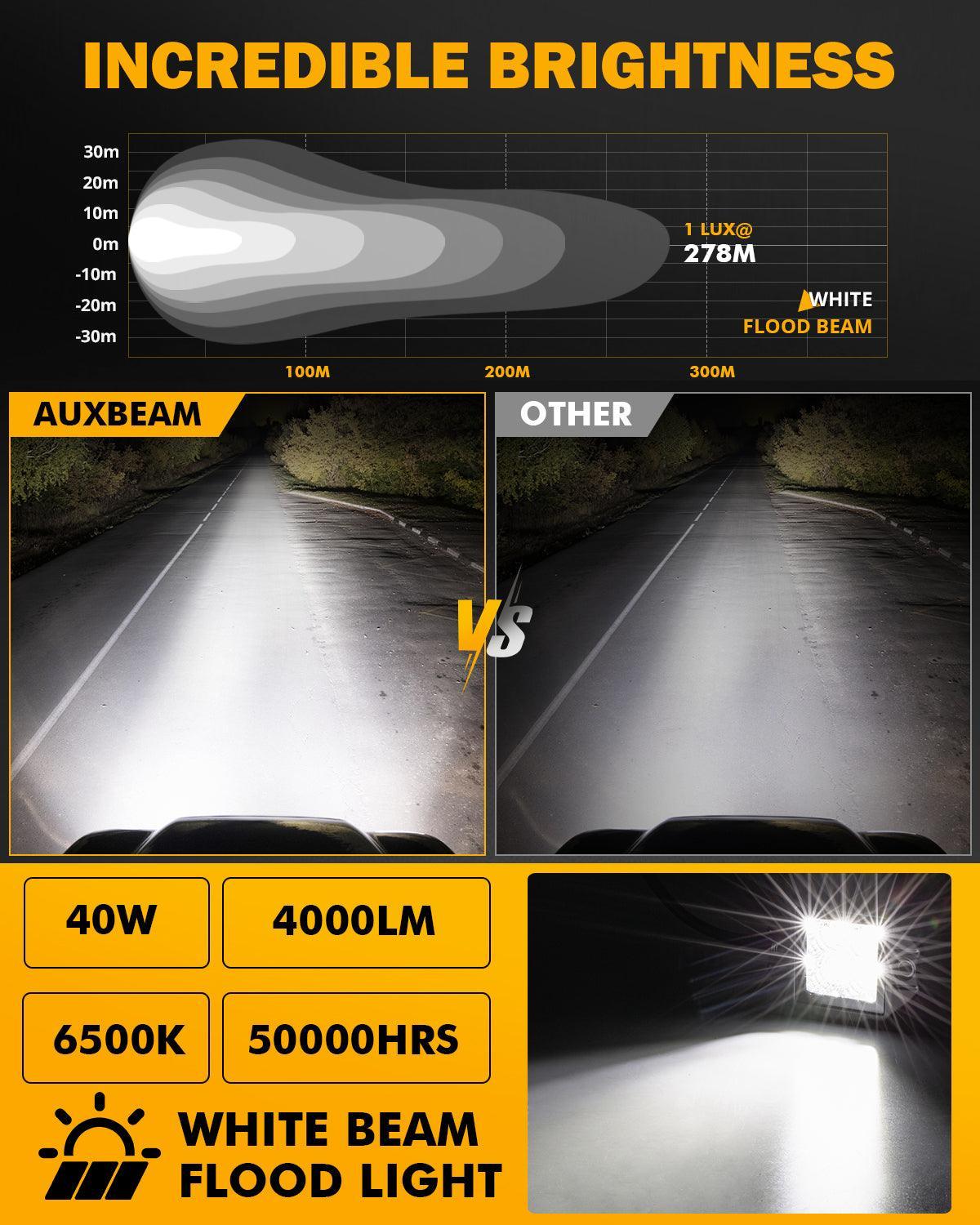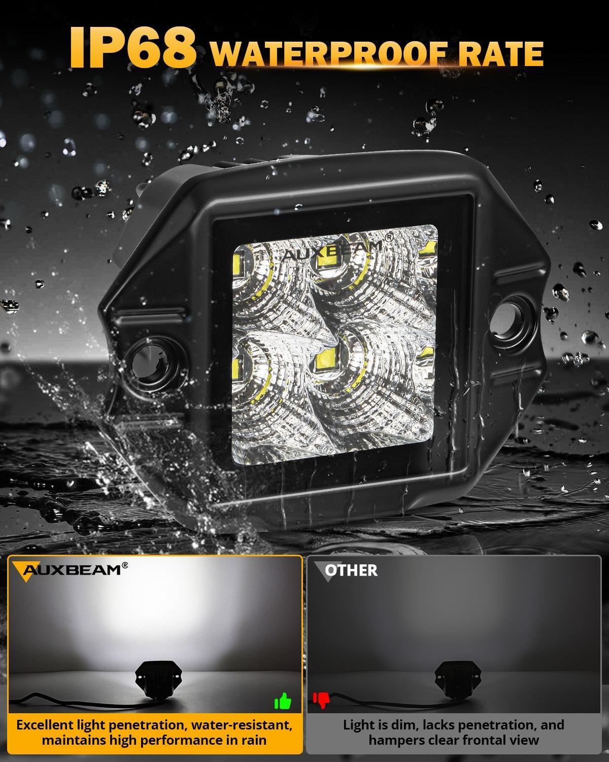 IP68 Waterproof Design: Auxbeam LED work light features IP68 waterproof rating, high quality housing and sturdy brackets. This ensures that rain, fog, moisture or dust cannot seep and cause damage. Rugged die-casting aluminum body designed for optimal heat removal, handles rough off-road environments and resists corrosion.