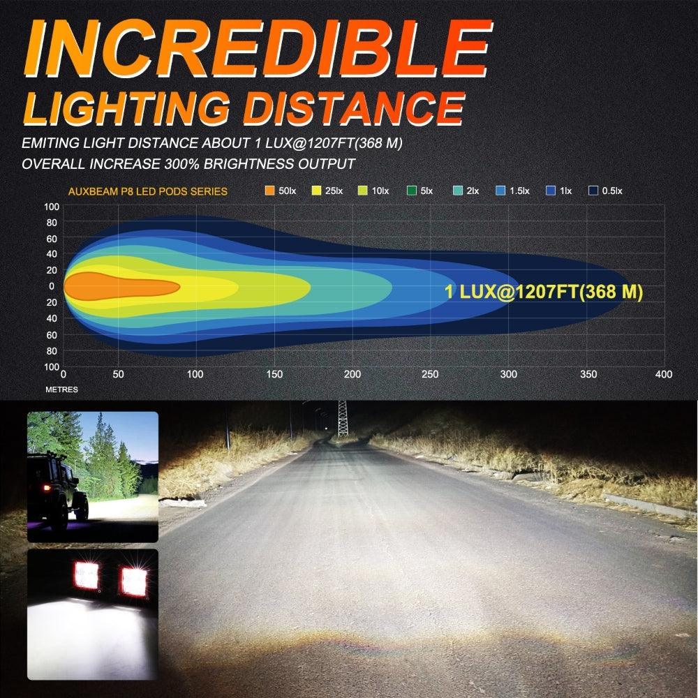 - Made of high-intensity P8 chips and unique UV PC, 4800 lumens and 6500K color temperature, luminous efficiency rose 10%. Much brighter than stock light pods or other light pods, will improve your off-road and night driving experience.