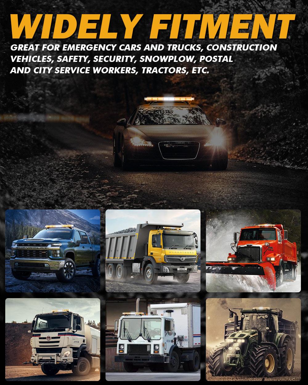 Perfect Bright: This emergency flashing light bar has a total of 72 high-power 3W LED chips. Crystal clear lens for max brightness, visible day and night. Great for law enforcement cars, plow trucks, construction vehicles, tractors, security, snowplow, postal, mail carrier, and city service workers, to warn of potential hazards.
