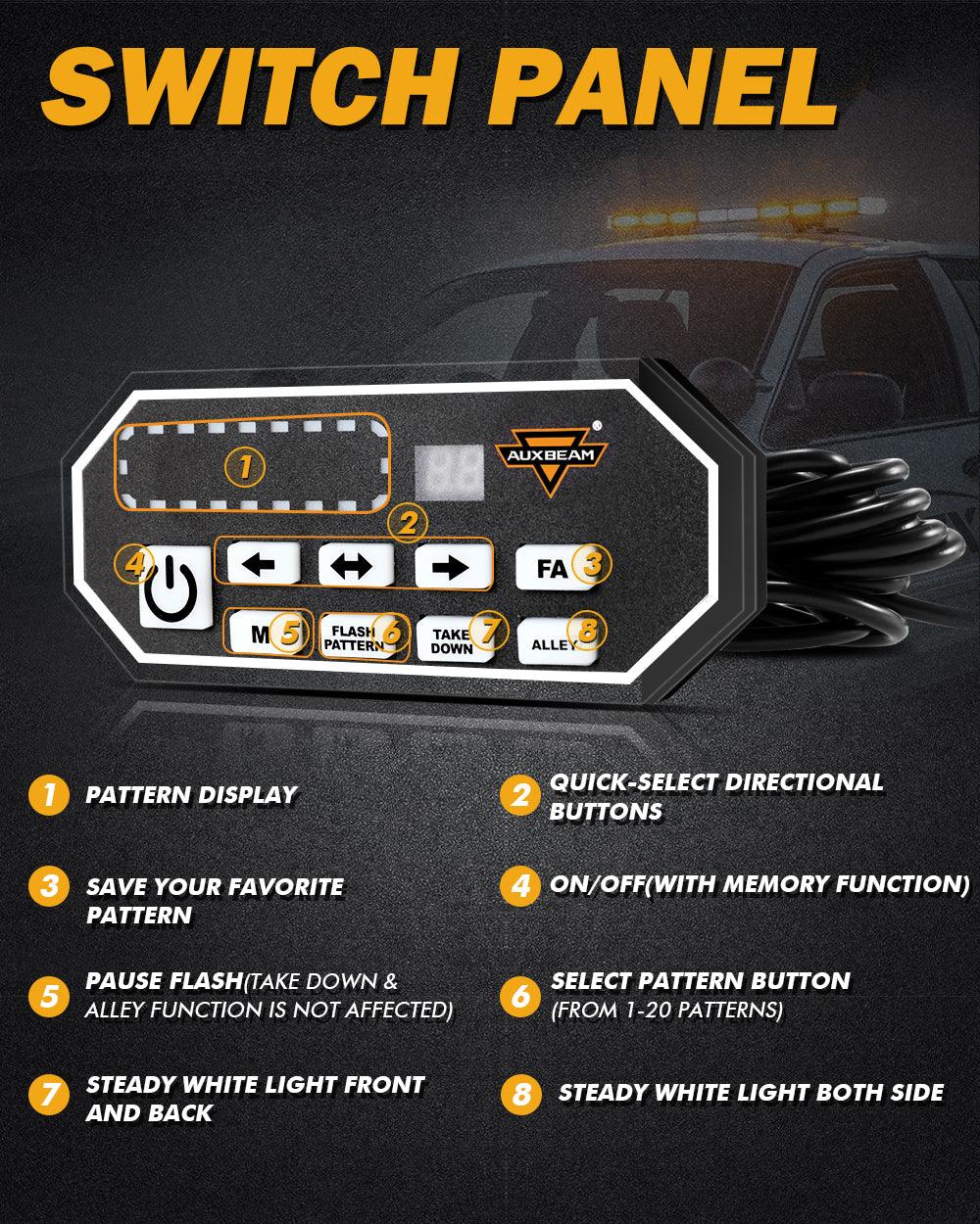 Traffic Advisor Function: Provides caution to potential upcoming hazards.Easy to switch between 20 different strobe flashing modes for quick respondent ever times.These light modes will be controlled by the switch Panel B. It has left, right and both flashing functions. “Favorite” (choose your favorite mode, hold down FA for three seconds, and you will remember this mode. Every time you press this button, you will jump straight to this feature), “M”(Pause button, press other buttons are not powerless, only the take down & alley function can control), “Take Down”(steady white light front and back), “Alley“(steady white light both side), and there will be a corresponding light mode display and mode number display on the switch panel B.