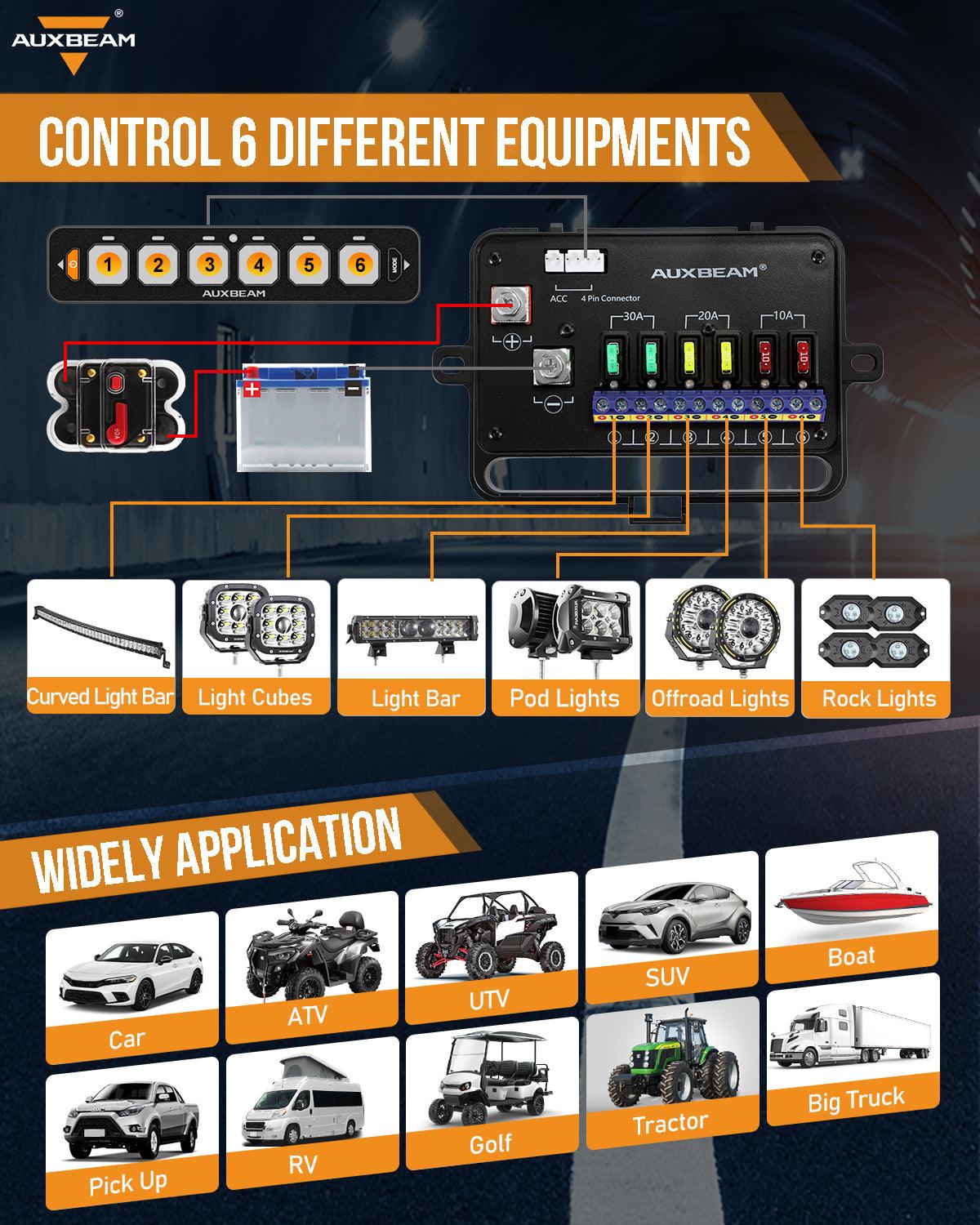 - Wide Application. The Auxbeam cable extension has a broad range of applications and can be utilized to extend control over any vehicle electrical appliance for your modification needs. This includes, but is not limited to UTVs, trucks, trailers, buses, motorhomes, and long-distance parking aid sectors