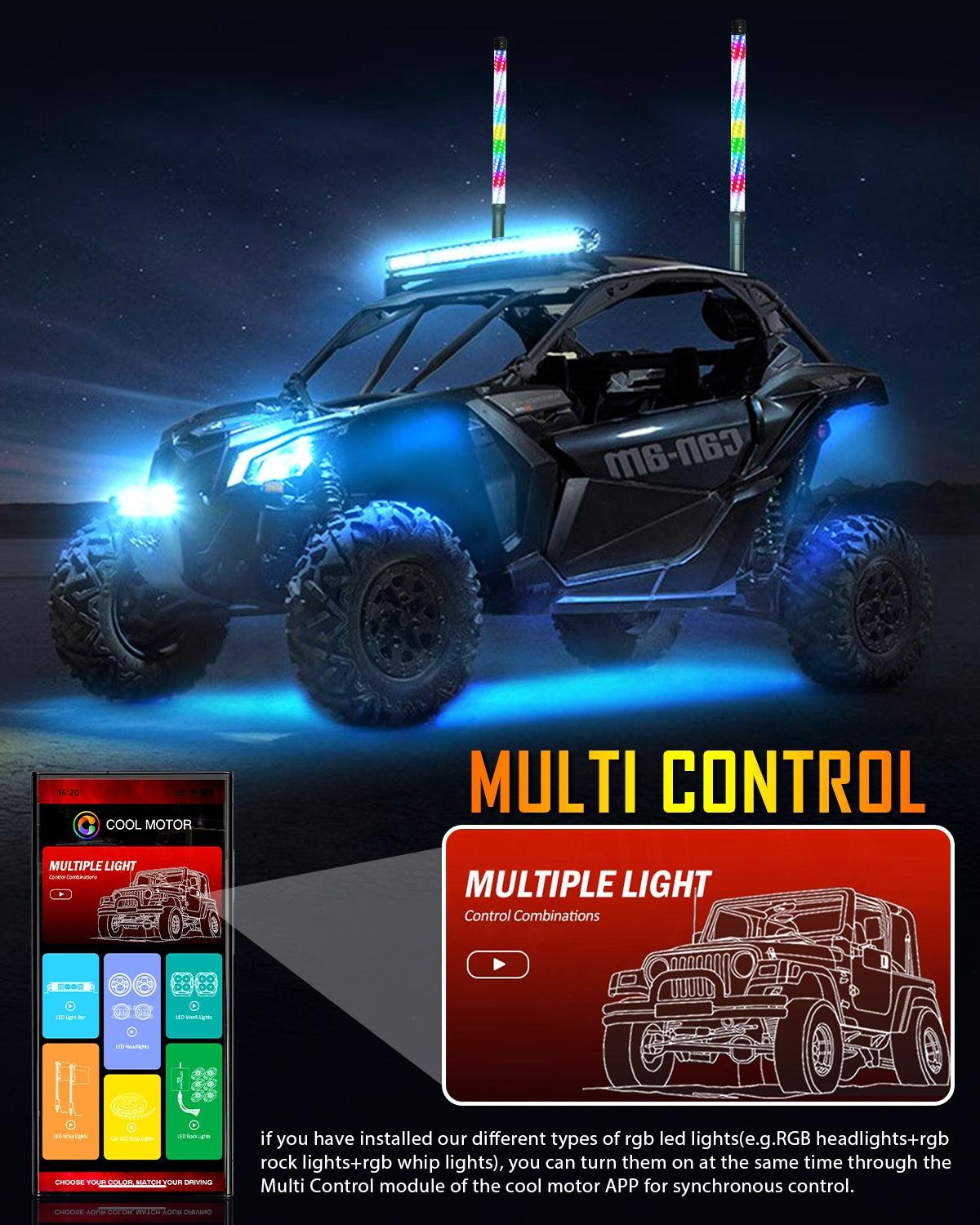 Exclusive Cool Motor APP: The program can not only connect multiple sets of RGB whip lights, but also connect different types of RGB lights (rock lights, headlights, etc.). (Only Cool Motor APP versions of RGB lights are supported.)
