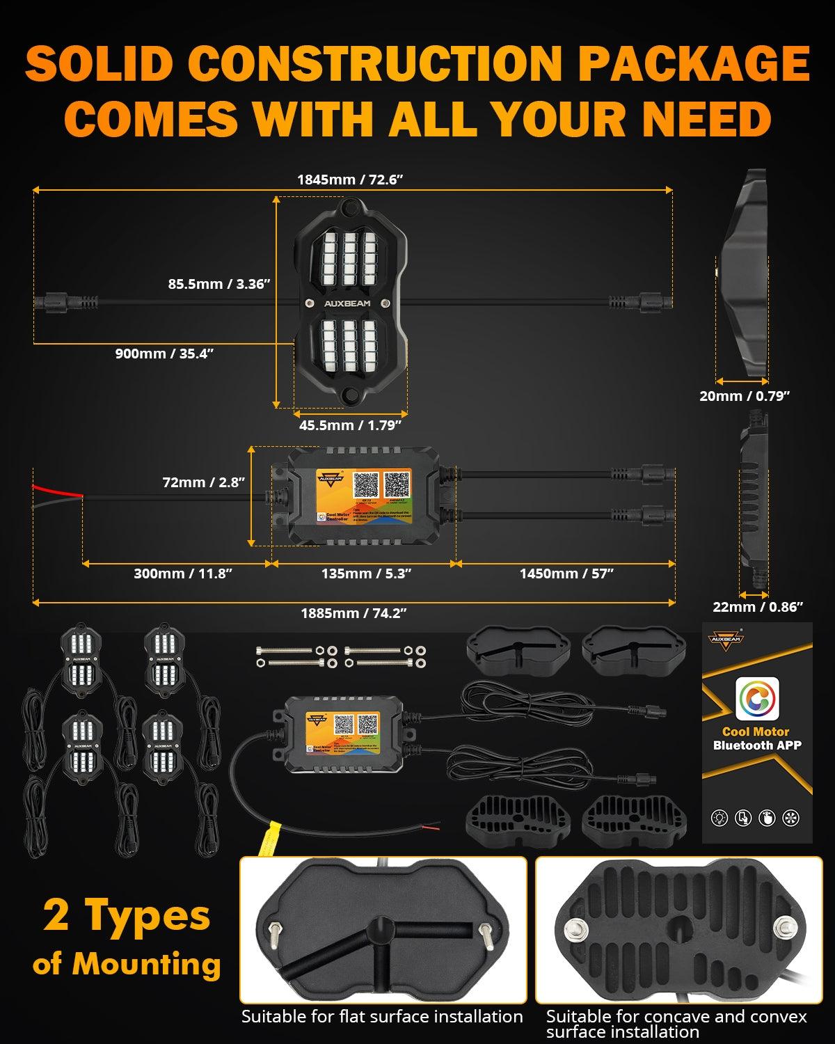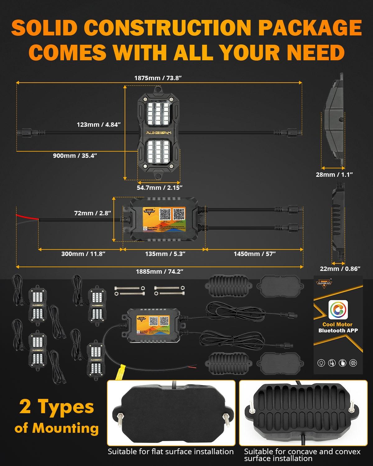 Exclusive Cool Motor APP: The program can not only connect multiple sets of RGB rock lights, but also connect different types of RGB lights (whip lights, headlights, etc.). (Only Cool Motor APP versions of RGB lights are supported.)