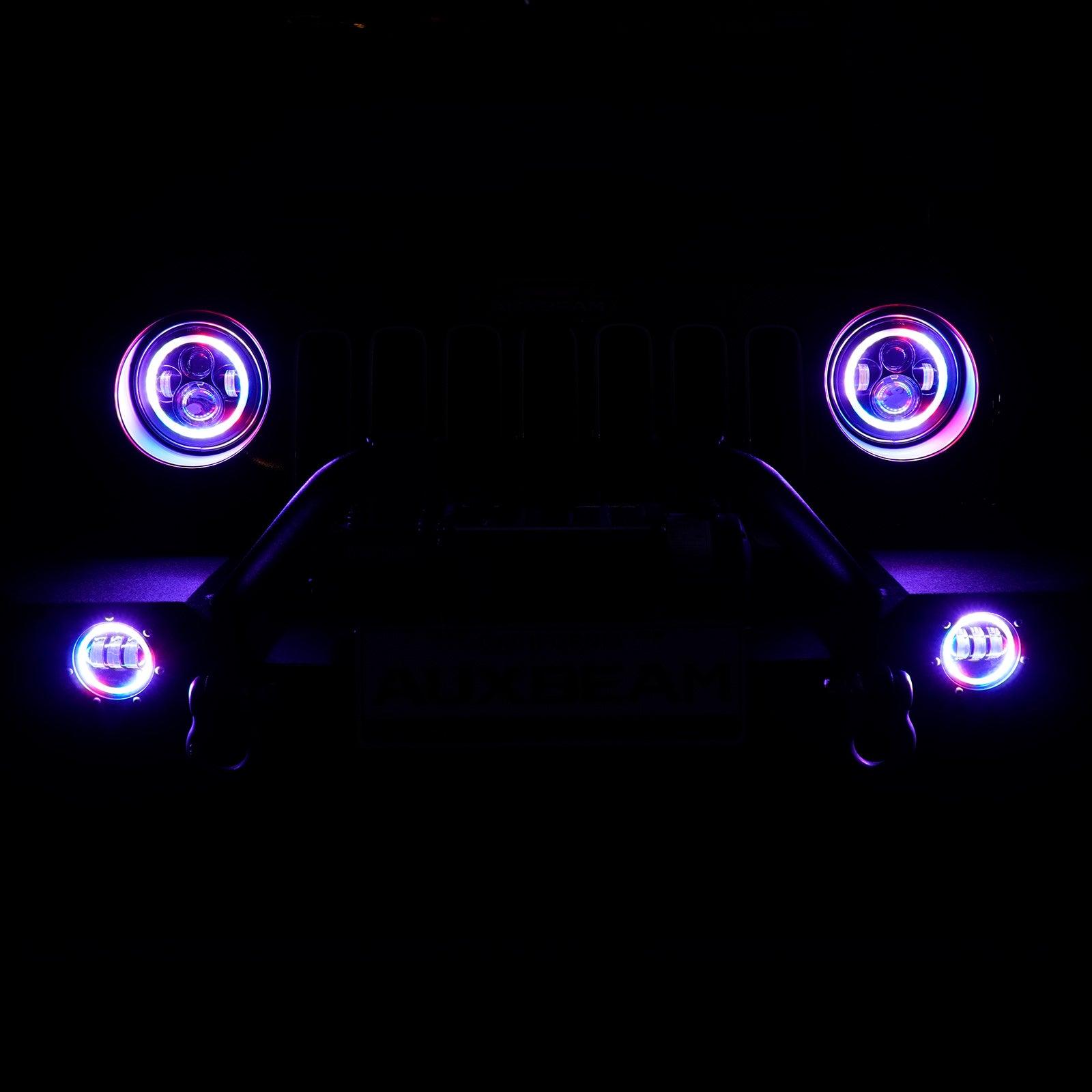 - RGB headlights & fog lights combo set is equipped with RGB Halo ring and amber turn signal lights. Various flashing types, preset static colors and patterns let you out of the crowd. All-in-one function, Bluetooth controlled; IOS and Android compatible, timing function, music mode, flashing function, automatic control.