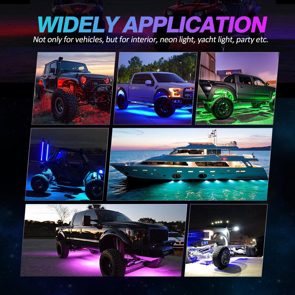 Auxbeam RGBW LED rock lights can be used for Motorcycle, Off-Road, Truck, Car, Boat, Dome, SUV, UTV, ATV, etc. Easy to install, DIY style, mounted the place for what you want.