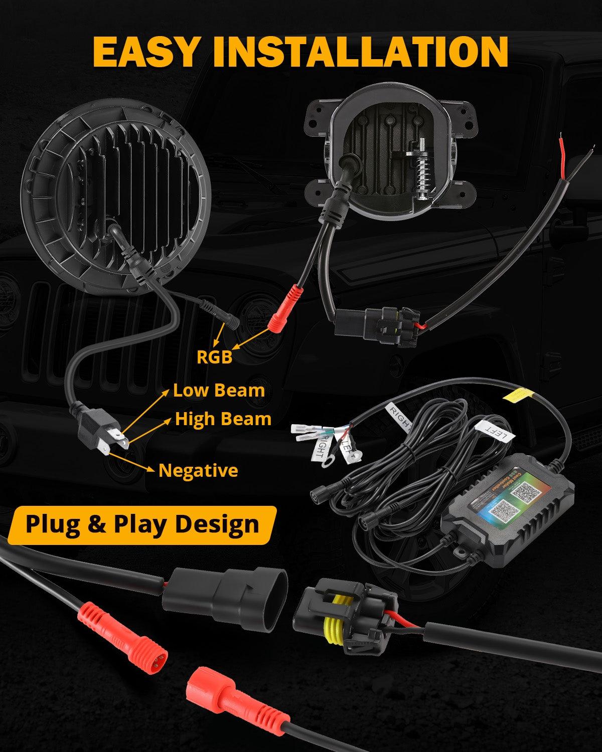 Upgraded RGB 7 Inch Headlights + 4 Inch Fog Lights Combo for Jeep Wrangler JK with APP Control