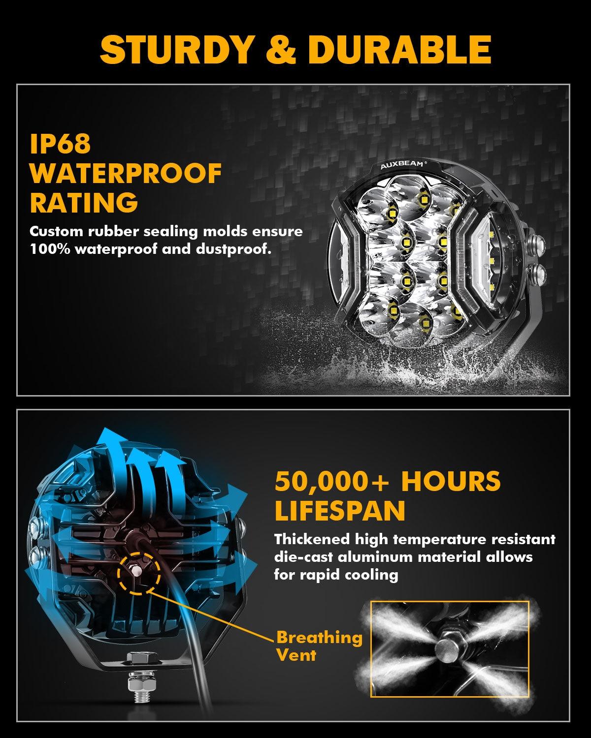 IP68 Waterproof Design: Our newest LED work light has IP68 waterproof rate, protective housing, and sturdy brackets. This ensures that rain, fog, moisture, or dust won't penetrate the bar and cause damage. With exceptional waterproof, dustproof, and shockproof performance, you can trust that our led driving light will withstand even the toughest conditions.