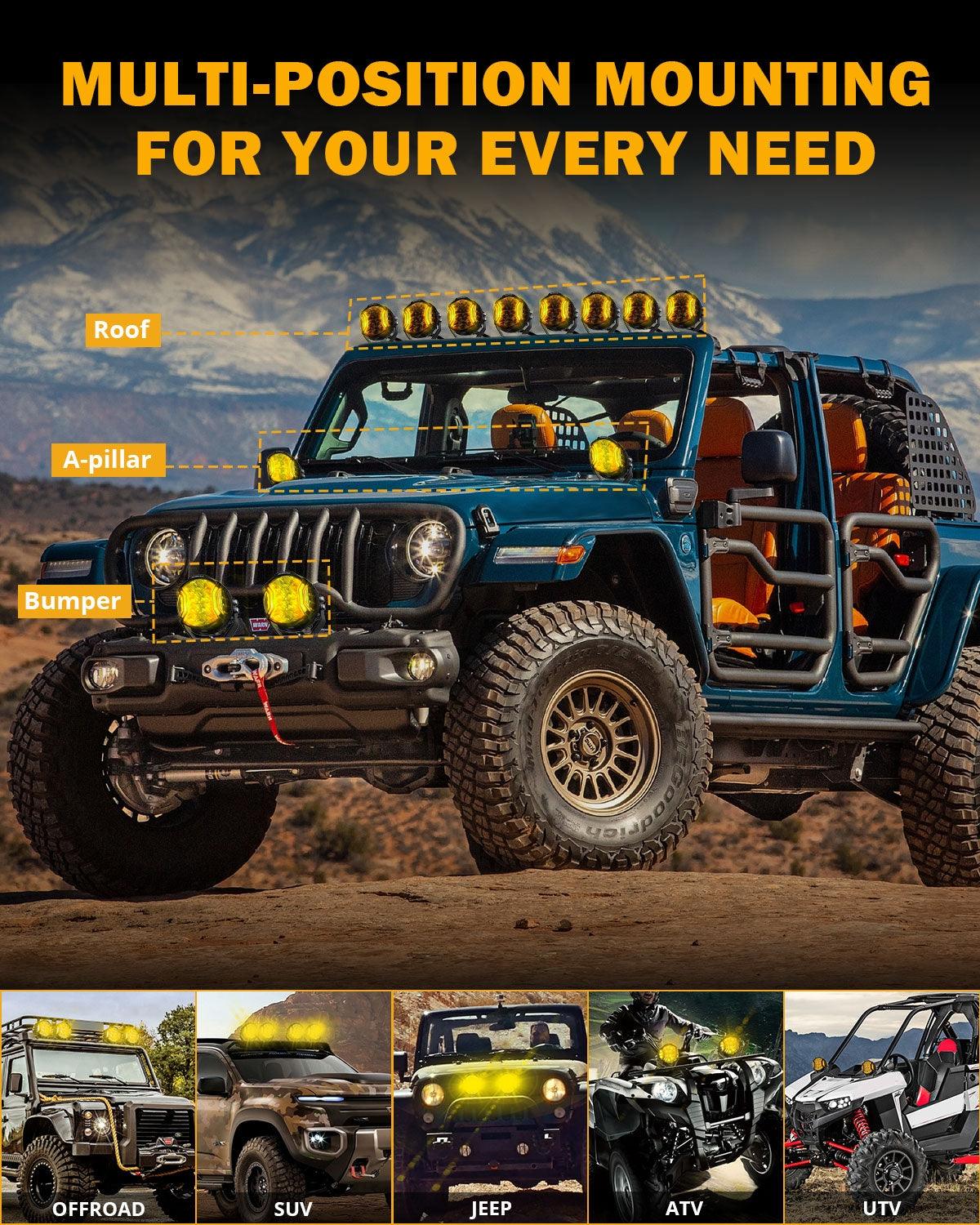 Wide Application: Our LED pod lights are incredibly versatile and can be mounted on a variety of surfaces, including the roof rack, bull bar, headache rack, and running bar. They're suitable for use with almost all off-road vehicles, motorcycles, ATVs, UTVs, SUVs, construction vehicles, trucks, buses, pick-ups, marine vessels, boats, and more. With an operating voltage of 9-24V, our LED pod lights are a reliable and efficient lighting solution for all your needs.