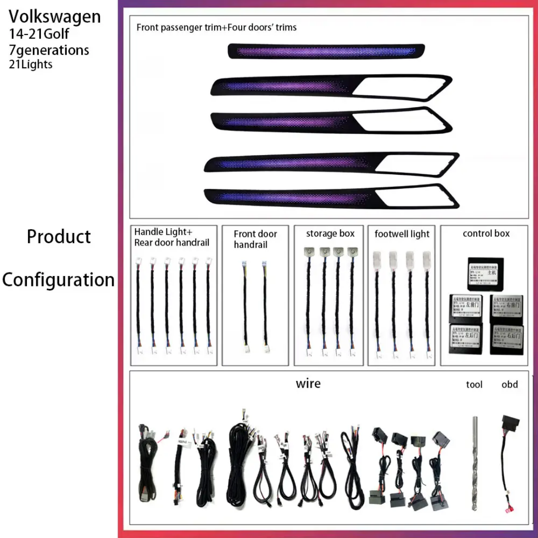 Ce kit est entièrement compatible avec tous les modèles de Volkswagen Golf 7 produits entre 2014 et 2021, quelle que soit la finition. Offrez à votre Golf un intérieur digne des modèles premium avec le kit LED "Dragon Scale". Ce n'est pas seulement un éclairage, c'est une véritable expérience.