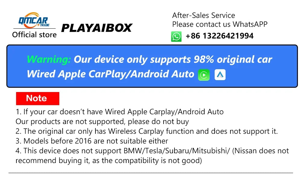 1. This product only supports OEM car radios with 98% wired Apple Carplay/Android Auto