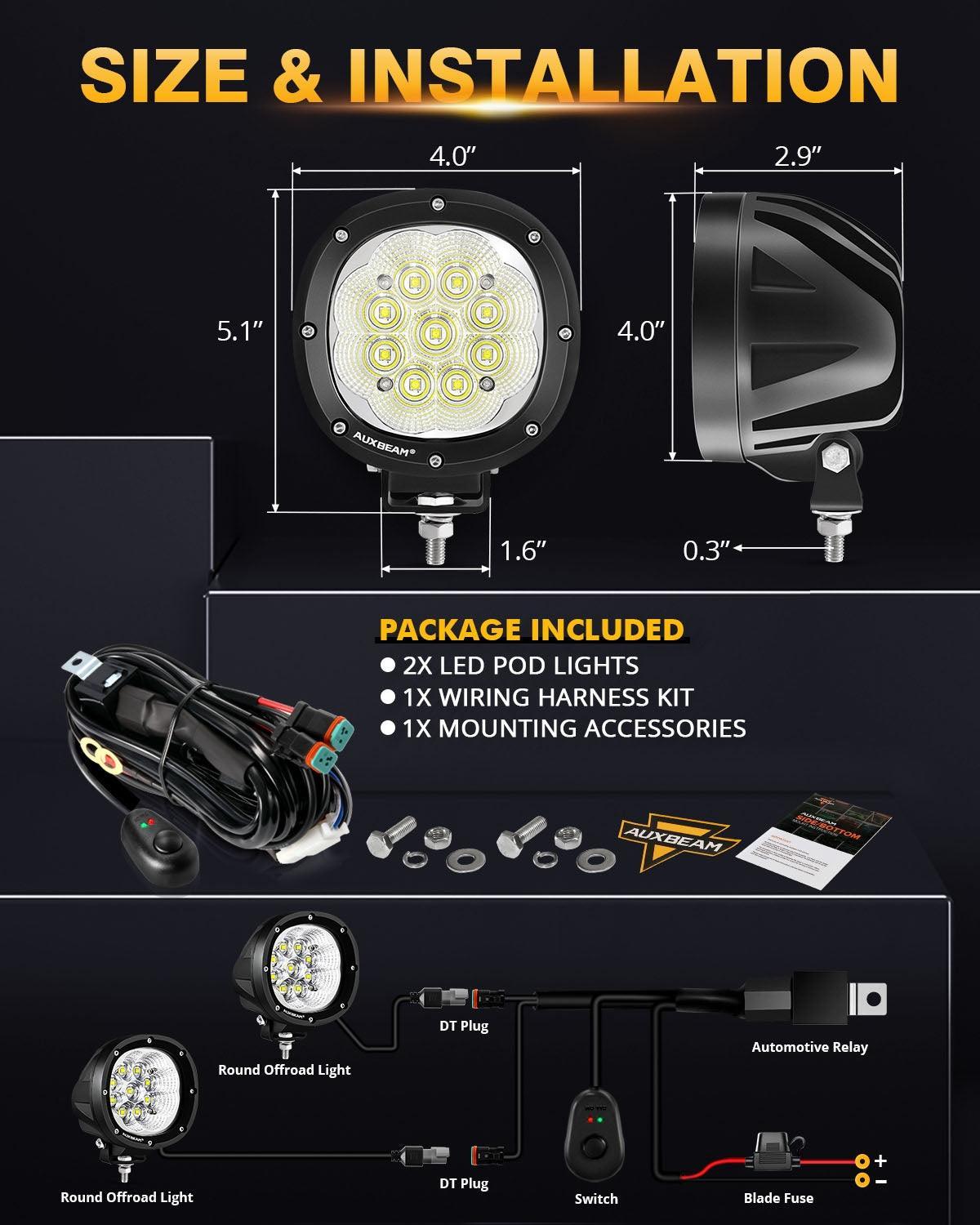 Compatible: The wiring harness of the LED Pod Light is suitable for two-wire single mode only ON/OFF main light, and also includes the 6 in 1 2PIN DT Plug 40A fuse and relay. Built-in blade fuses to prevent overcurrent and short circuit to ensure the safety of the vehicle electrical system.